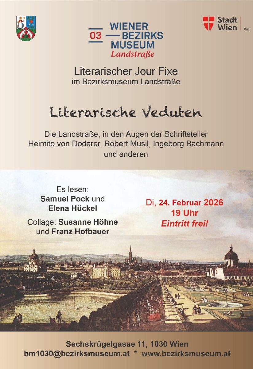 Das Bezirksmuseum Landstraße (3., Sechskrügelgasse 11) setzt die beliebte Kultur-Reihe „Literarischer Jour-fixe“ in der Saison 2024 unter der neuen Leitung von Susanne Höhne fort.